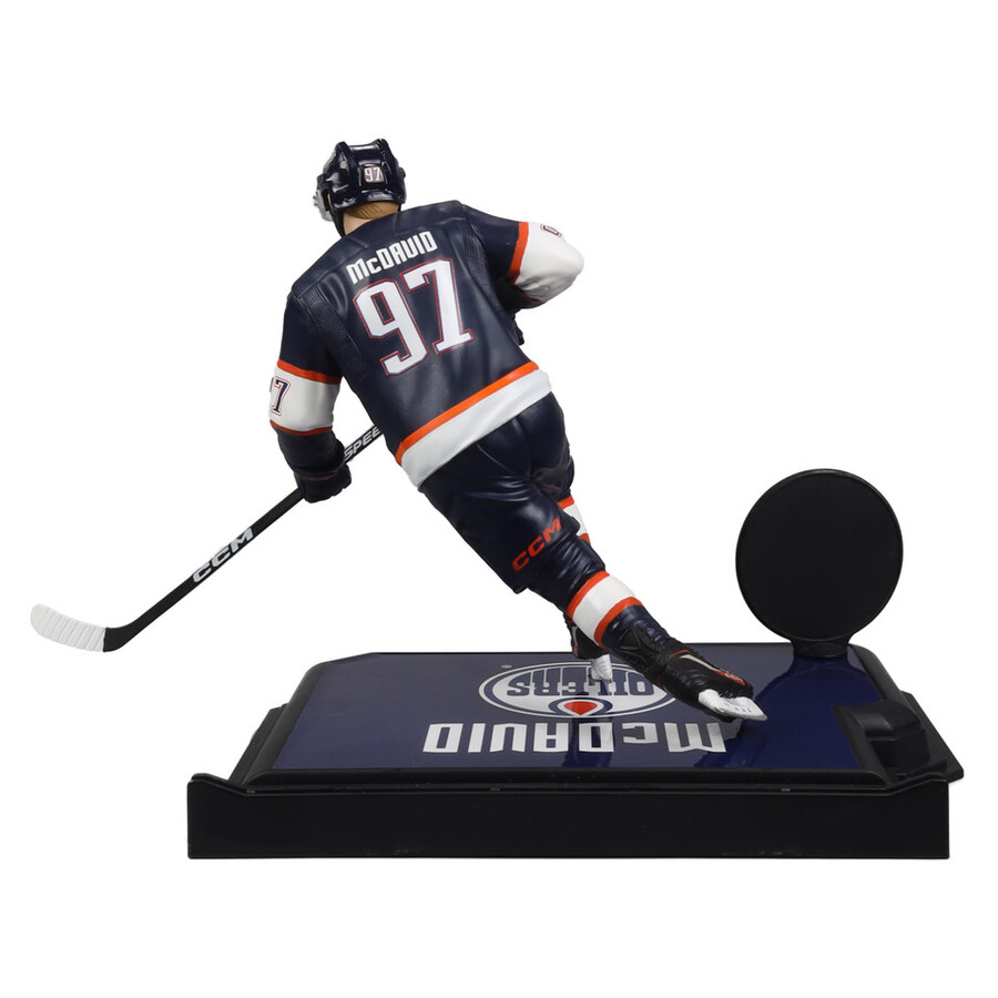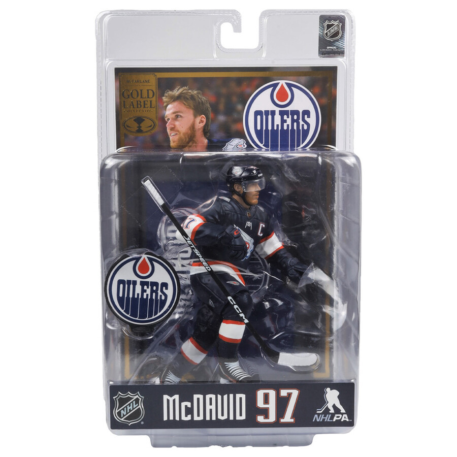 Edición Limitada Etiqueta Dorada. Firmada por Todd McFarlane y numerada individualmente a partir de 2001. McDavid fue la primera elección del Draft de la NHL de 2015, nombrado para el Equipo de Novatos de la NHL, se convirtió en el capitán más joven en la historia de la NHL y en el jugador más joven en ganar el Trofeo Art Ross al máximo anotador de la NHL. McDavid ha ganado el premio al Patinador Más Rápido en la Competencia de Habilidades All-Star de la NHL tres veces, ha sido cuatro veces All-Star del Primer Equipo de la NHL, cinco veces ganador del Trofeo Art Ross, cuatro veces ganador del Premio Ted Lindsay, tres veces ganador del Trofeo Hart Memorial y ganador del Trofeo Maurice “Rocket” Richard para 2022-23 como el máximo anotador de la liga. Goleador. Él y Wayne Gretsky son los únicos dos jugadores en la historia de la NHL en ganar por unanimidad el Trofeo Hart Memorial como Jugador Más Valioso de la liga.